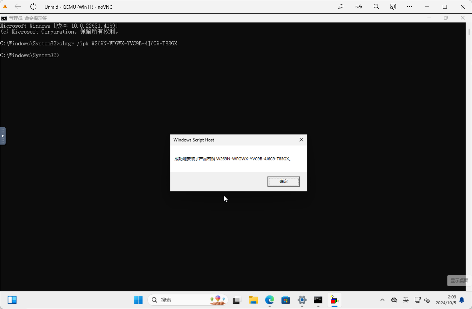 以管理员身份运行CMD,输入下面指令回车安装/更新激活密钥