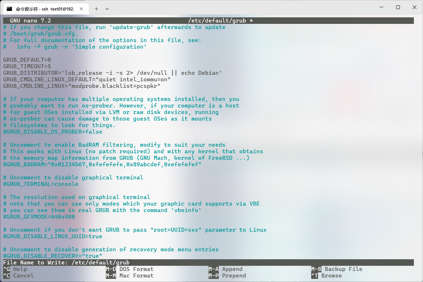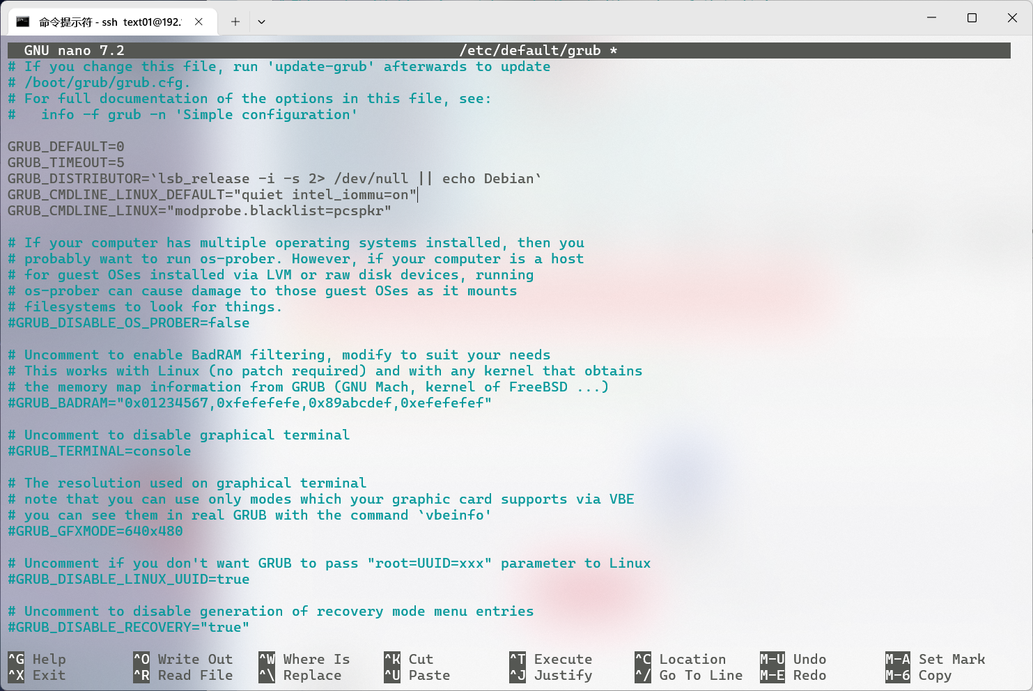 GRUB_CMDLINE_LINUX_DEFAULT="quiet intel_iommu=on"