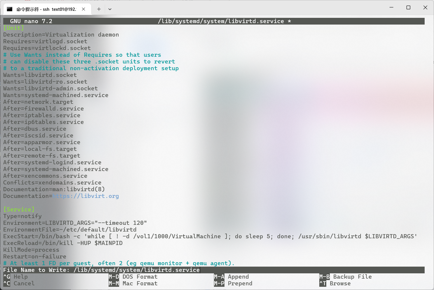 ExecStart=/bin/bash -c 'while [ ! -d /vol1/1000/VirtualMachine ]; do sleep 5; done; /usr/sbin/libvirtd $LIBVIRTD_ARGS'其中:/vol1/1000/VirtualMachine更换为你的虚拟机文件夹路径
