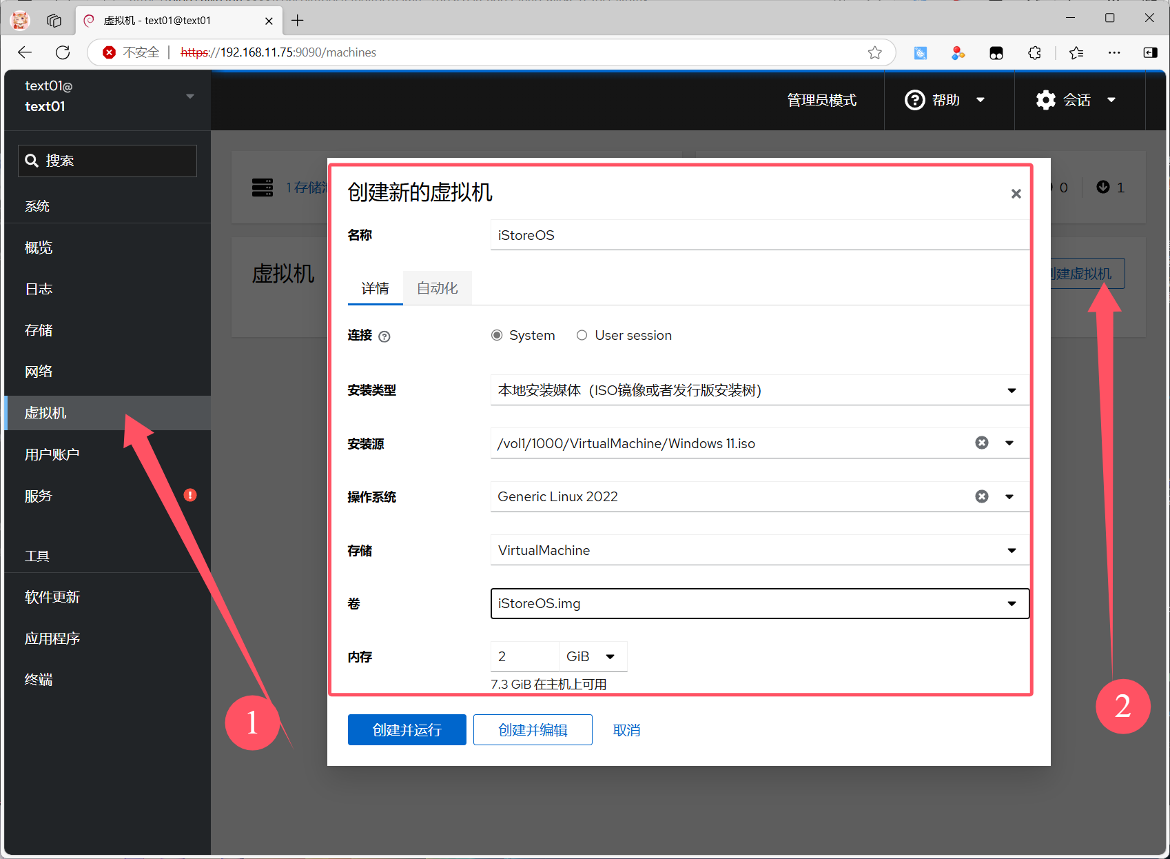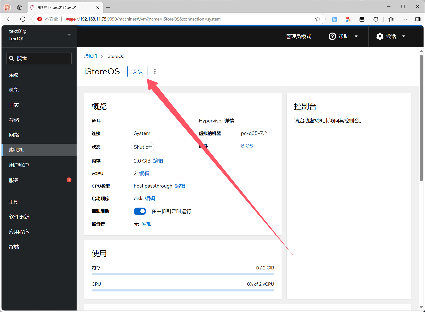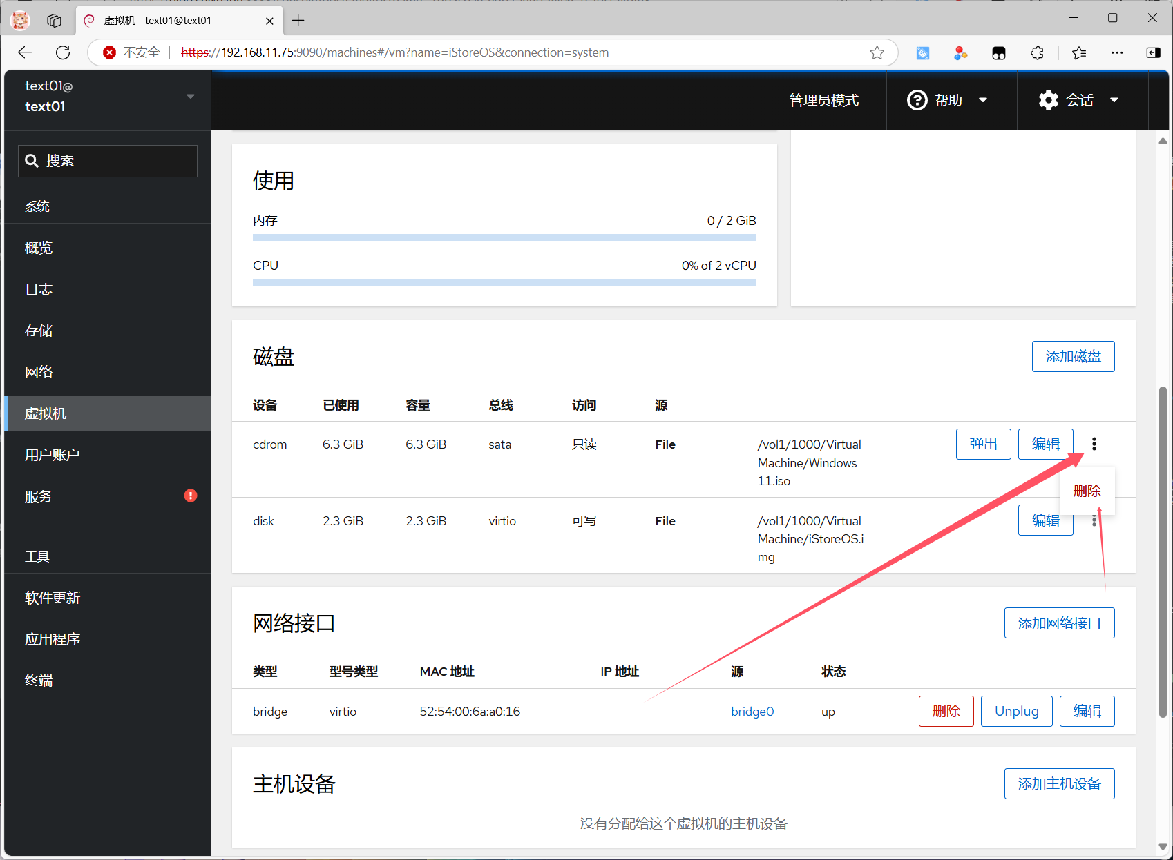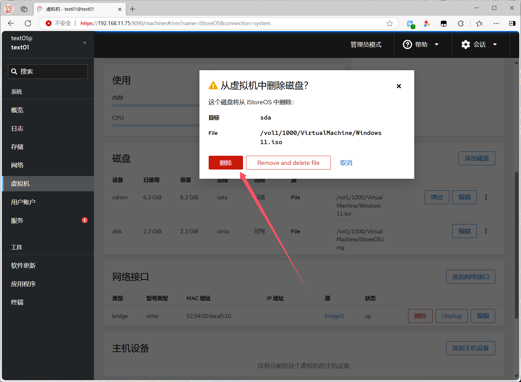 安装源选择刚刚上传到文件夹里的Windows11 iso镜像(随便一个iso镜像都行),选择镜像的原因是iStoreOS是使用img镜像直接启动,无需iso文件安装,但是KVM管理页面无法填写空白路径启动,所以随便选一个iso文件就行