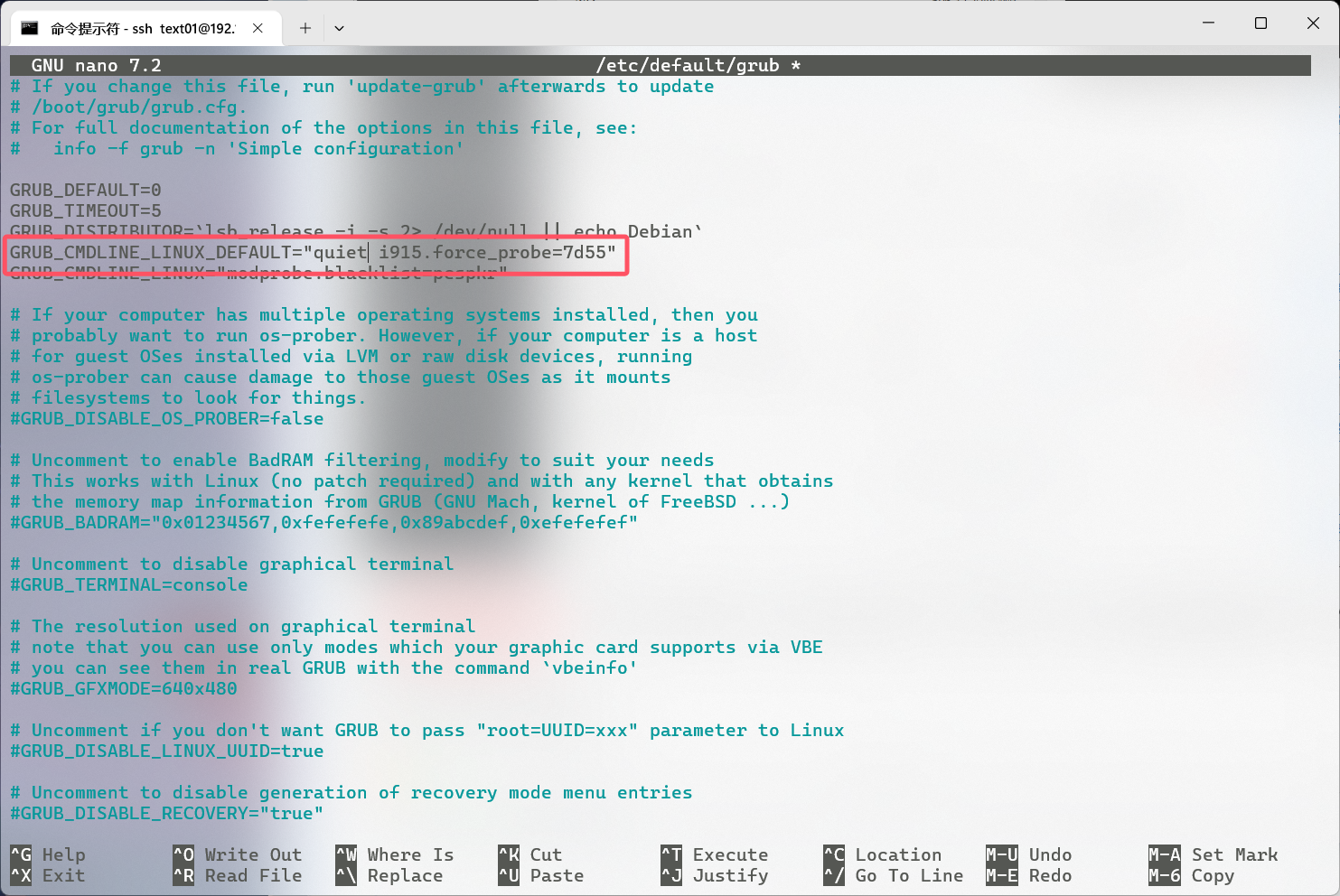 修改GRUB_CMDLINE_LINUX_DEFAULT="quiet i915.force_probe=7d55"为