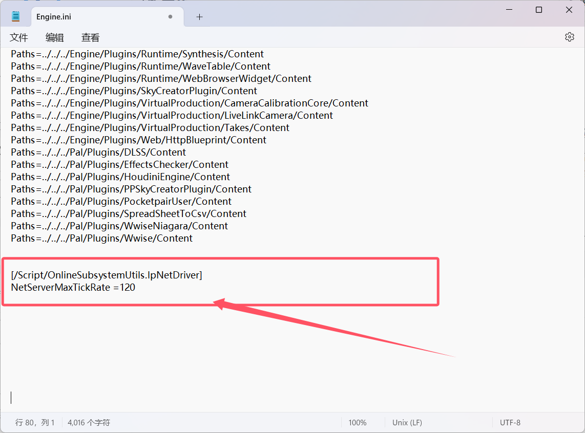 关闭游戏服务器后,将以下代码复制到游戏服务器文件Engine.ini最后面即可,然后保存重启服务器