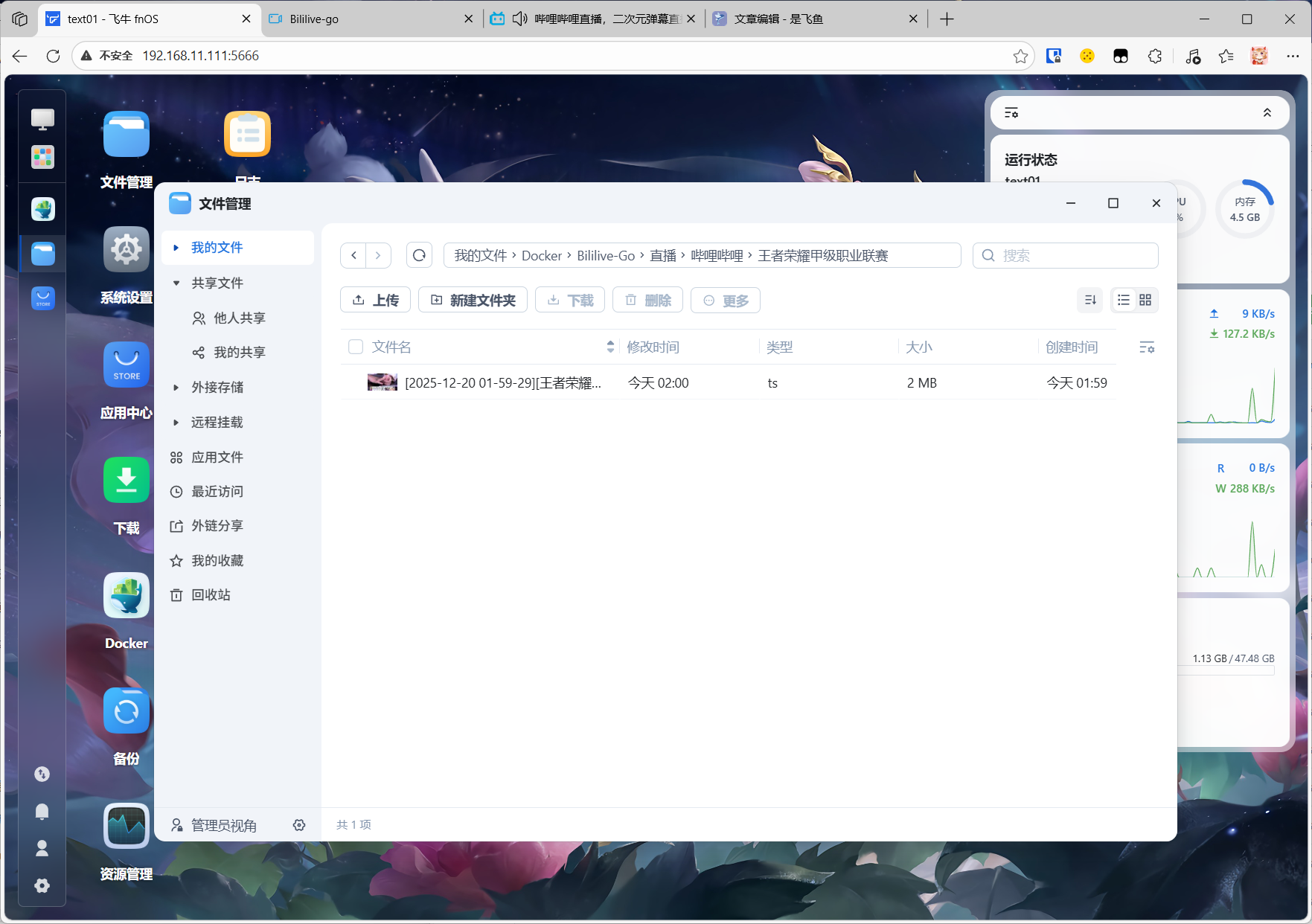 查看录制文件:录制的视频会保存在飞牛文件管理器的