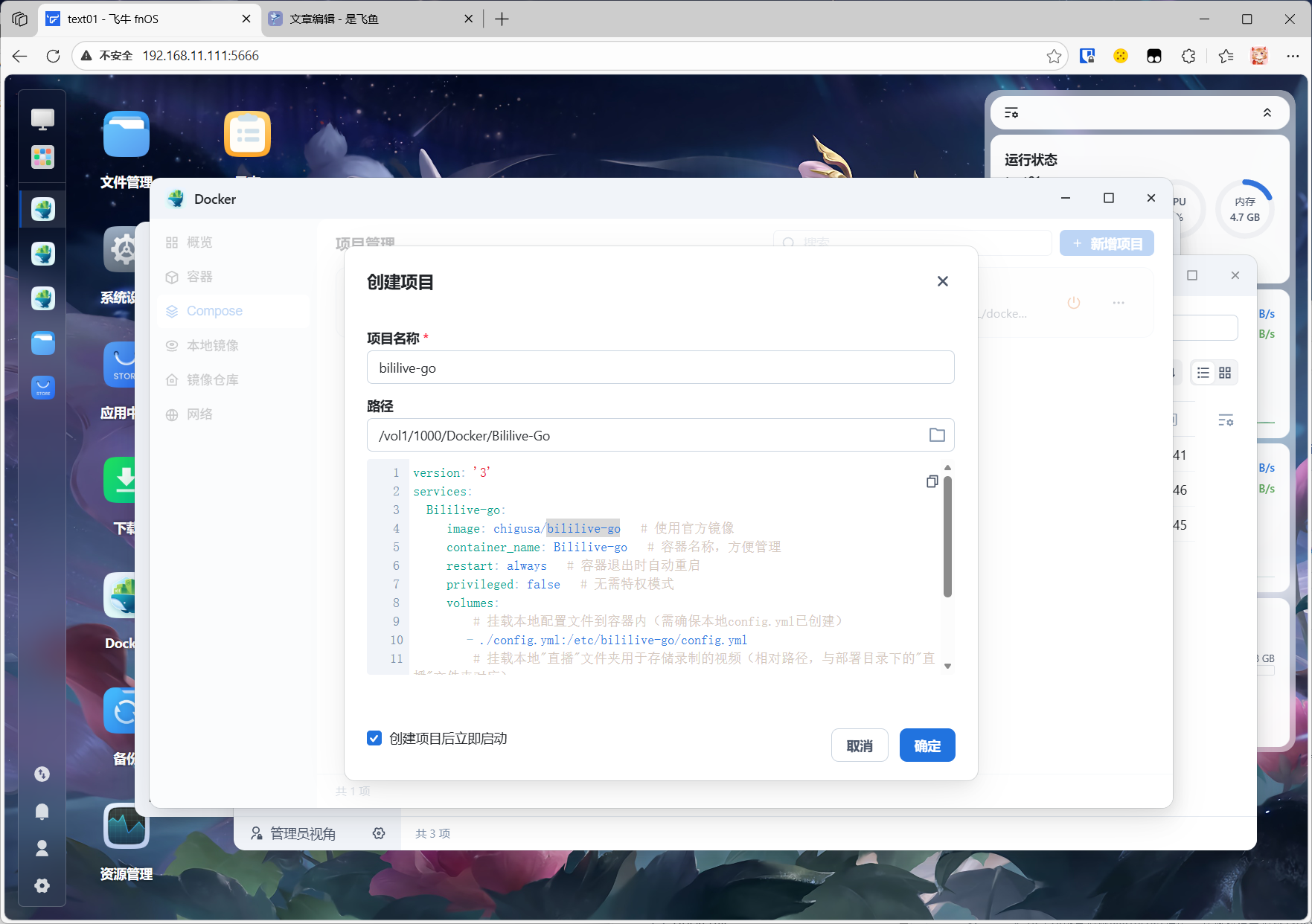 步骤 3:通过飞牛 Docker 界面启动服务(无需终端命令)