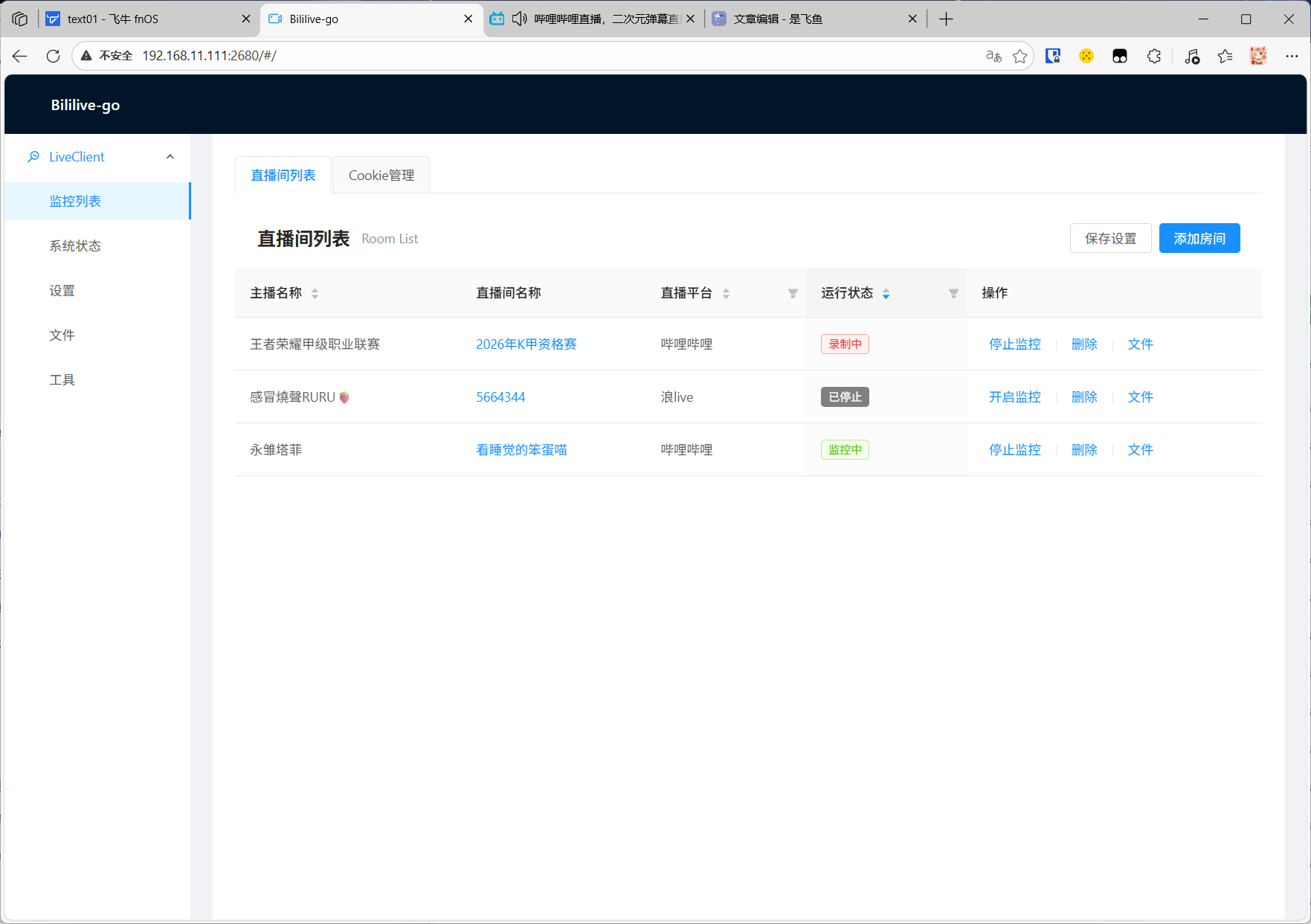http://飞牛NAS的IP地址:2680,进入 Bililive-go 的 Web 控制台添加录制任务:在界面中输入 B 站直播间 ID,设置录制模式(手动 / 自动)、清晰度等参数