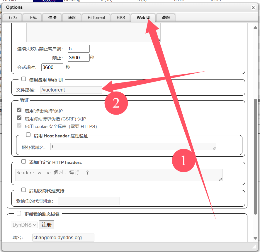 webui设置,勾选使用备用web ui,填写主题文件夹路径(容器内路径,就是映射路径),我这里映射的路径是/vuetorrent,记得点击最下面的保存